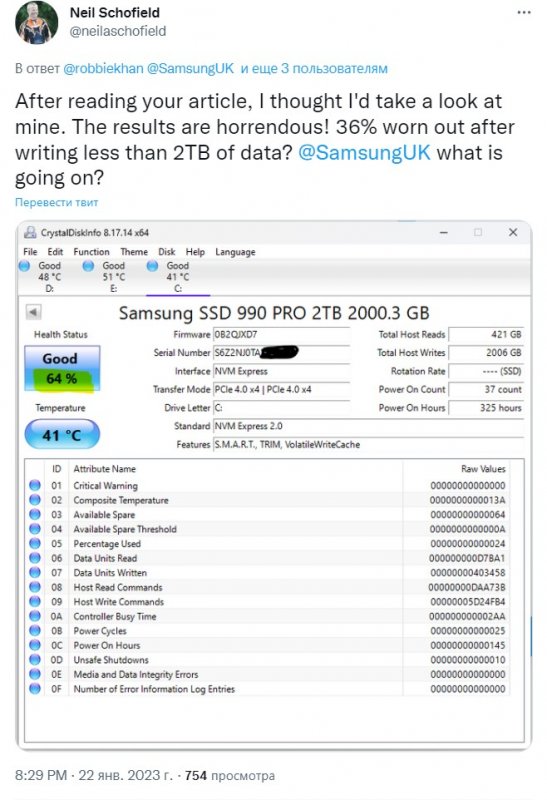 С проблемой быстрого износа Samsung 990 Pro столкнулся не только редактор Neowin. Как пишет портал ComputerBase, об аналогичных ситуациях в конце декабря сообщали пользователи его форума. В одном из случаев на Samsung 990 Pro ёмкостью 1 Тбайт было перезаписано всего 1,7 Тбайт информации. Однако ресурс носителя снизился после этого до 96 %. Во втором случае модель 2 Тбайт потеряла 7 % после перезаписи 2 Тбайт информации. Пользователь Twitter Нил Скофилд сообщил о ещё более неприятном наблюдении. Ресурс его Samsung 990 Pro снизился со 100 до 64 % после перезаписи всего 2 Тбайт информации или после перезаписи 0,17 % от заявленного производителем TBW.