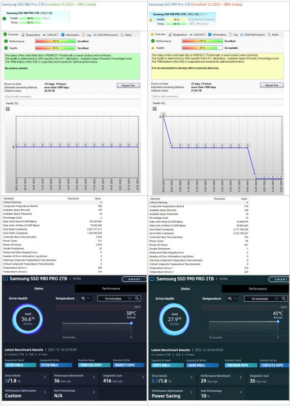 Указанная проблема также обсуждается на форуме Reddit, где владельцы Samsung 990 Pro делятся своими наблюдениями. Например, один из форумчан сообщил, что ресурс его SSD снизился до 93 % после перезаписи всего 1,6 Тбайт информации. Пользователь Reddit с псевдонимом FCS3 предоставил наглядное сравнение (изображение ниже) скорости износа Samsung 990 Pro и модели Samsung 980 Pro с помощью программы мониторинга Hard Disk Sentinel. После трёхнедельного активного использования накопителя Samsung 990 Pro на него было перезаписано 28 Тбайт информации. Его ресурс снизился до 88 %. В то же время на модель Samsung 980 Pro было перезаписано 36 Тбайт информации, но его показатель здоровья составил после этого 98 %. Для обоих накопителей заявлен одинаковый показатель TBW — 1200 Тбайт.