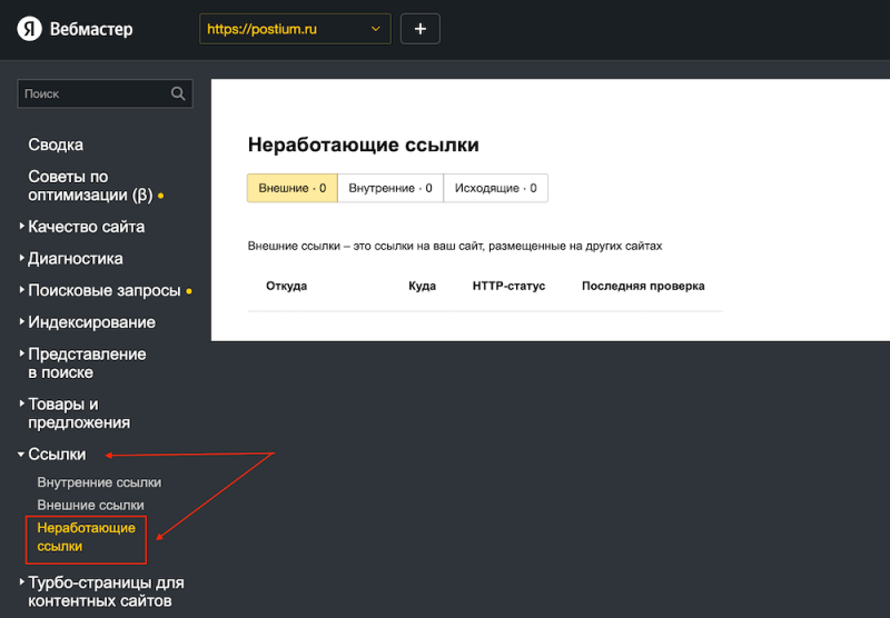 Чтобы зайти в новый раздел откройте Вебмастер, выберите «Ссылки — Неработающие ссылки».