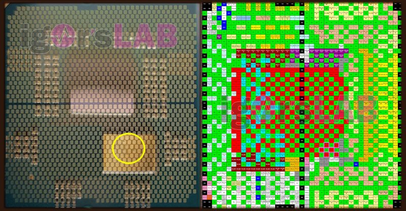«Собранная мною схема контактных площадок [процессоров Ryzen 7000 и Ryzen 7000X3D], показывающая места повреждений. AMD предоставила только четыре отдельных квадрата [с контактными площадками], даже не масштабировав изображения к единому размеру. Однако стоит учитывать, что контакты на реальном процессоре (фото слева) смещены от центральной линии, в то время как на схеме контактов (на изображении справа) они расположены в шахматном порядке. Если учесть это смещение контактов на фотографии реального процессора и соотнести их с местом контактов на схеме (выделены фиолетовым), то становится очевидным, что указанные контакты связаны с функцией VDDCR (CPU Core Power Supply), отвечающей за питание процессора», — пишет Валлосек.