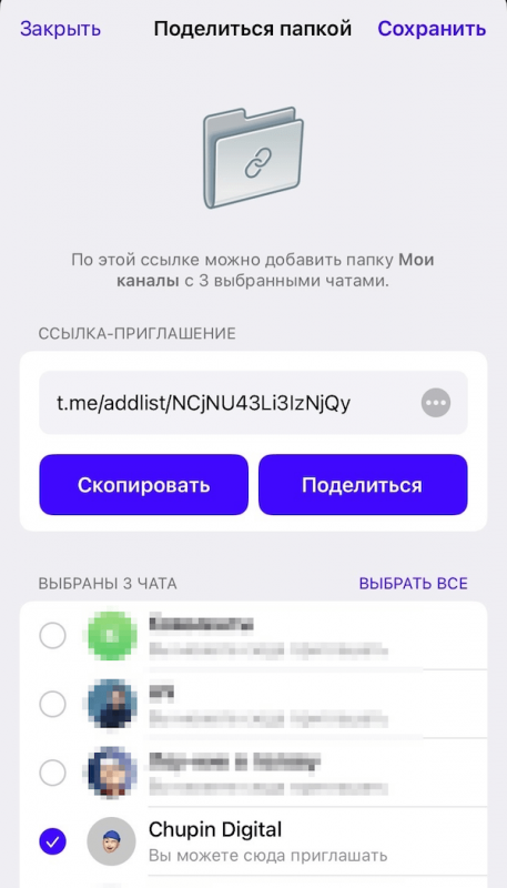 Для каждой папки можно создать несколько пригласительных ссылок, дающих доступ к разным наборам чатов. Также, для каждой ссылки можно выбрать своё название.