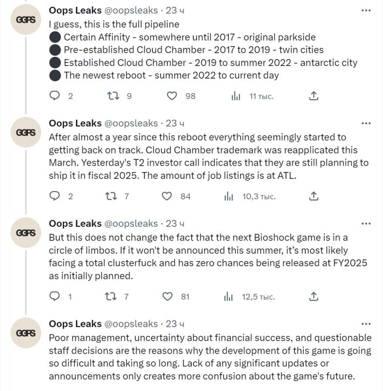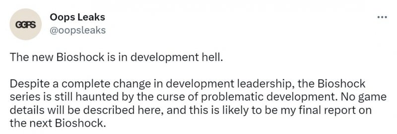 «Новая BioShock находится в производственном аду, — написал Oops Leaks в Twitter. — Несмотря на полную смену руководства, серию по-прежнему преследует проклятие проблемной разработки. Подробностей о самой игре на этот раз не будет. Скорее всего, это моё последнее сообщение о ней».