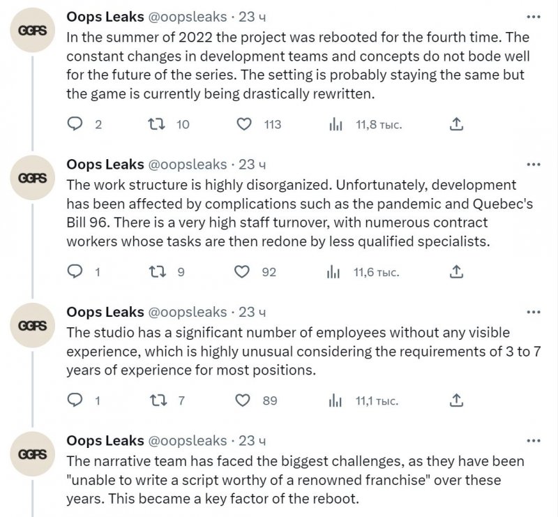 О проблемах проекта Oops Leaks сообщал ещё в феврале 2022 года. Тогда инсайдер рассказал об уходе ключевых сотрудников и недовольстве издателя темпами разработки, однако отметил, что состояние игры ещё не напоминало производственный ад, а выпустить её могли к концу 2024 года.