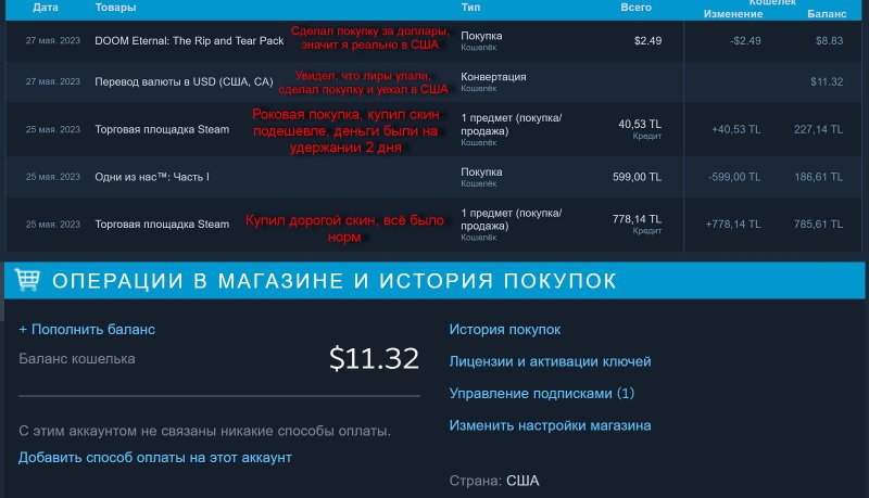 При этом система возвращает таких пользователей не только в родные РФ или РБ: некоторые игроки сообщают о принудительном переводе «турецкого» аккаунта в США или Францию и пересчёте денег из кошелька Steam в местную валюту.