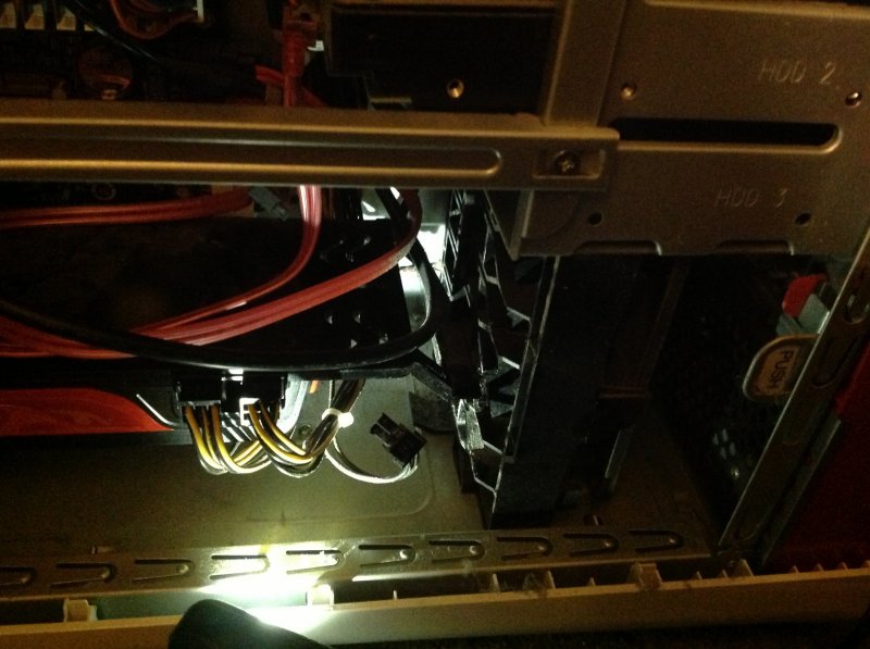 Розовой линей выделена область наиболее вероятного места изгиба видеокарты. Синим отмечен высокий вырез фиксатора PCIe