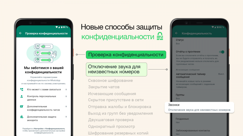 WhatsApp анонсировал появление новых функций безопасности в мессенджере — «Отключение звука для неизвестных номеров» и «Проверка конфиденциальности».