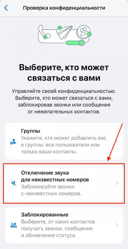 Чтобы отключить звук звонков с незнакомых номеров, зайдите в настройки, далее «Проверка конфиденциальности — Отключение звука для неизвестных номеров».