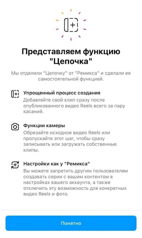 В Инстаграм* Reels появилась новая функция «Цепочка», которая позволяет объединять старые и новые ролики.