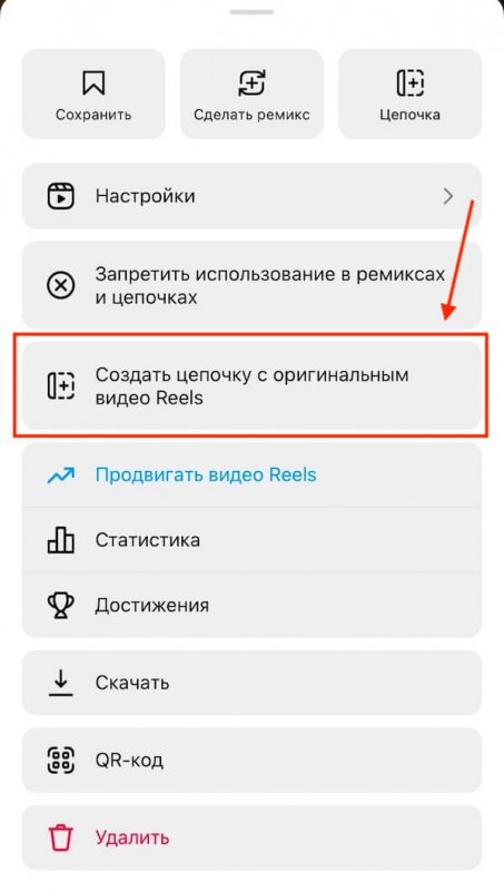Шаг 1. Найдите и откройте нужный рилс. Нажмите три точки справа для вызова меню и выберите создать цепочку.