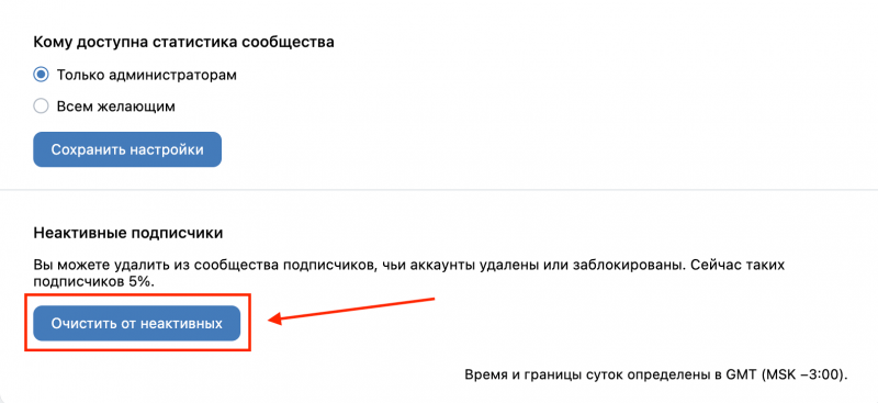 Шаг 4. В разделе «Неактивные подписчики» будут показаны данные о количестве неактивной аудитории в сообществе, чьи аккаунты удалены или заблокированы. Если их больше 1%, то вам будет доступна кнопка «Очистить от неактивных», нажмите её и дождитесь завершения процесса очистки.
