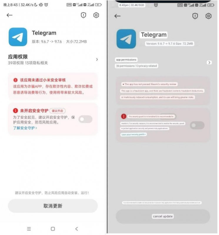 При попытке установить Telegram на устройство с MIUI пользователю выводится сообщение, что приложение «не прошло проверку безопасности Xiaomi» и, вероятно, представляет угрозу. Достоверность этой информации подтвердили несколько источников, пишет «Код Дурова».
