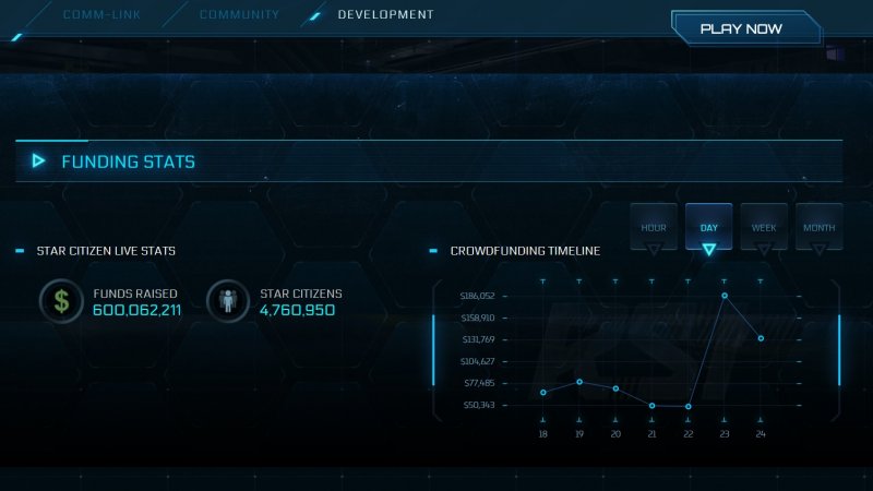 Как стало известно, по состоянию на 25 августа 2023 года на производство и развитие Star Citizen в рамках краудфандинговой инициативы Cloud Imperium Games было привлечено уже свыше $600 млн. Количество вкладчиков при этом достигло 4,76 млн человек (4,4 млн при достижении $550 млн).
