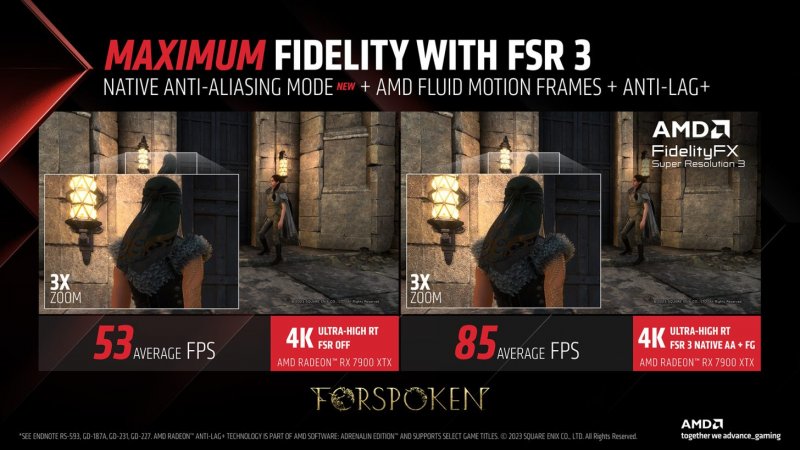 Компания AMD в рамках своего мероприятия Gaming Festival 2023 на выставке Gamescom сообщила, что поддержку технологии масштабирования изображения FidelityFX Super Resolution (FSR) версии 3.0 первыми получат две игры — Forspoken и Immortals of Aveum. В перспективе список поддерживаемых игр будет расширяться. Важной особенностью технологии станет технология генерации дополнительных кадров, что повысит FPS в играх.