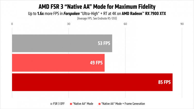 На сегодняшней презентации AMD показала возможности FSR 3.0 в игре Forspoken, запущенной в разрешении 4K, при использовании максимальных настроек качества изображения с трассировкой лучей. Для демонстрации был выбран режим FSR 3.0 «Производительность». Благодаря этому частота кадров игры увеличилась более чем в три раза.
