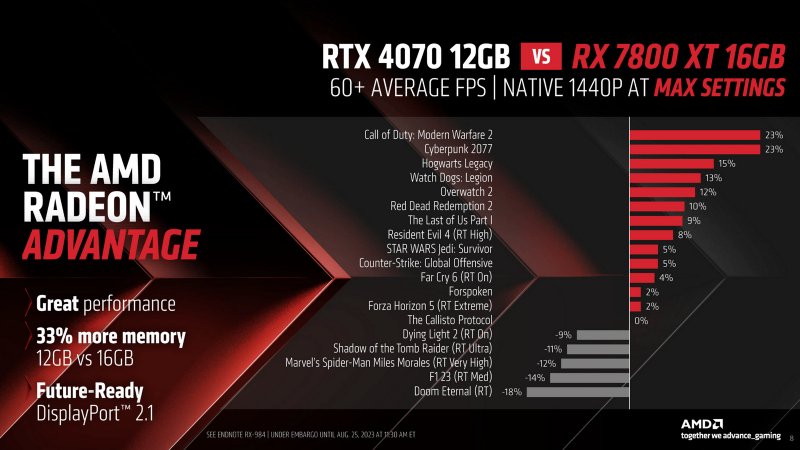 Что касается производительности, то AMD утверждает, что Radeon RX 7800 XT в среднем на 3,5 % опережает GeForce RTX 4070 в играх с разрешением 1440p при максимальных настройках качества графики. А в некоторых играх даже демонстрируют превосходство на величину от 5 % до 23 %, хотя в некоторых играх, использующих трассировку лучей, пальма первенства остаётся у GeForce RTX 4070.