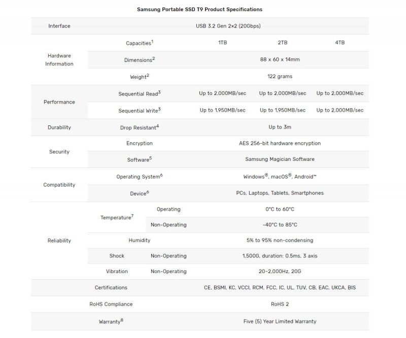 Размеры внешних SSD от Samsung составляют 88 × 60 × 14 мм, а их вес равен 122 г. Для них заявляется поддержка операционных систем Windows, macOS и Android.