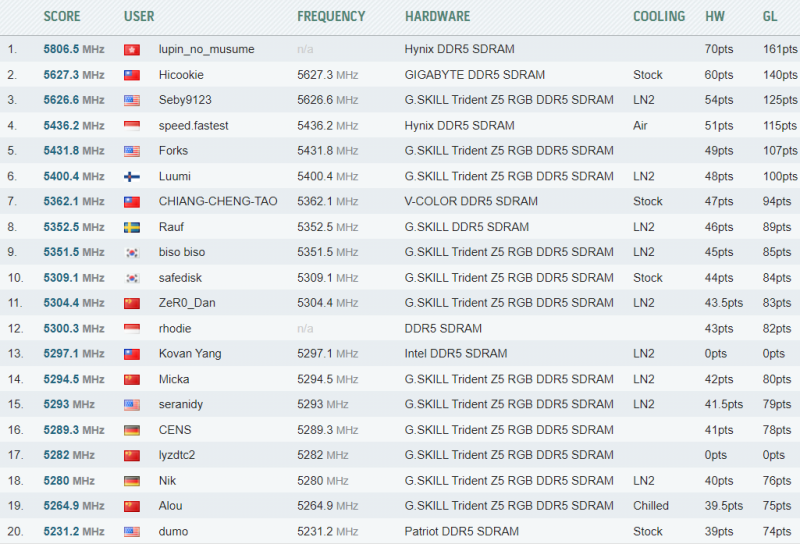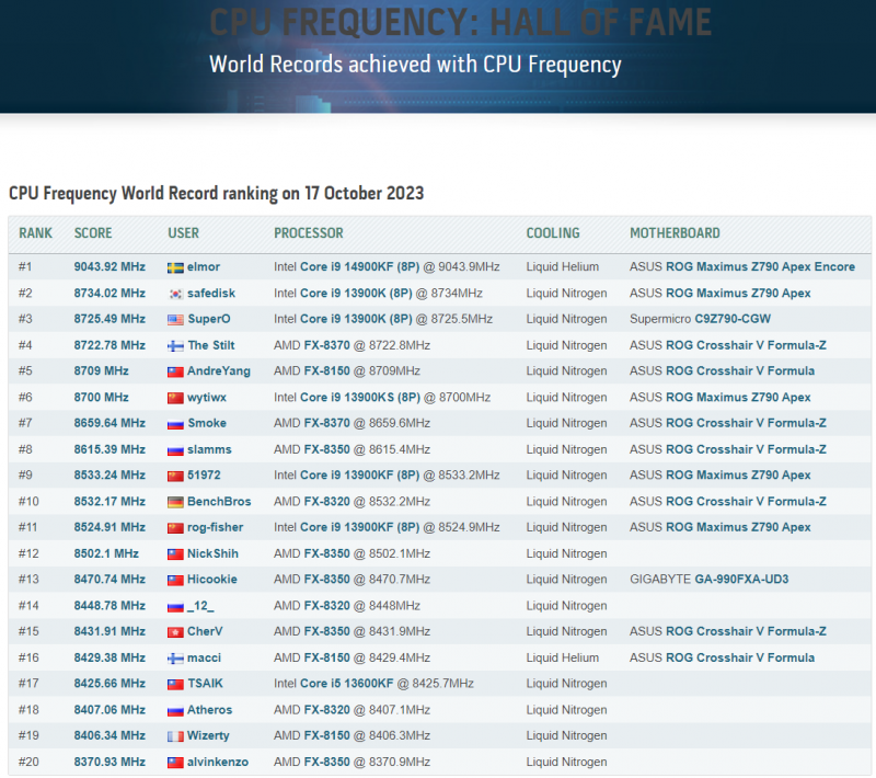 Таблица рекордов разгона частоты CPU. Источник изображения: HWBot