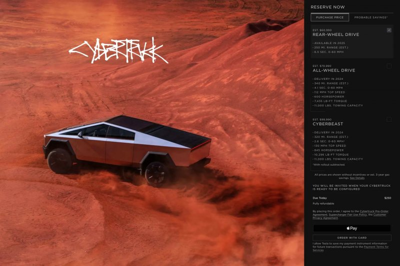 Cybertruck будет выпускаться в трёх вариантах комплектации. Самая доступная с ценой в $60 990 предложит привод на заднюю ось, разгон от 0 до 96 км/ч (60 миль в час) за 6,5 секунды, максимальную скорость в 180 км/ч и запас хода примерно на 250 миль (402 км). Данная версия станет доступна только в 2025 году, но на неё уже можно оформить предварительный заказ.
