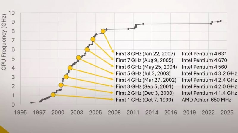 Частота 6 ГГц для процессора была впервые достигнута в мае 2004 года, 7 ГГц — в августе 2005-го, а скорость 8 ГГц — в начале 2007 года. Затем всё резко застопорилось. Лишь к концу 2022 года, то есть спустя более 15 лет с момента установки последнего рекорда, оверклокерам удалось преодолеть планку частоты процессора в 9 ГГц.