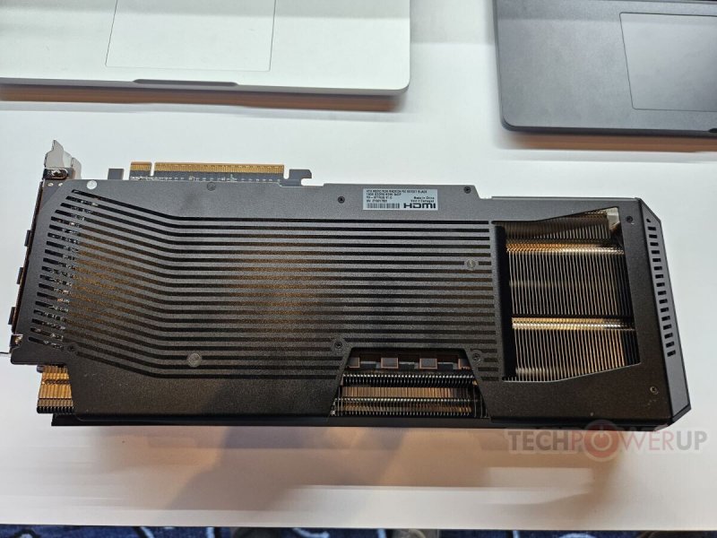 Чёрная карта оснащена огромным алюминиевым радиатором, а также тремя вентиляторами, по виду диаметром 90 или 100 мм. Задняя усиливающая пластина новинки имеет перфорацию в виде каналов.