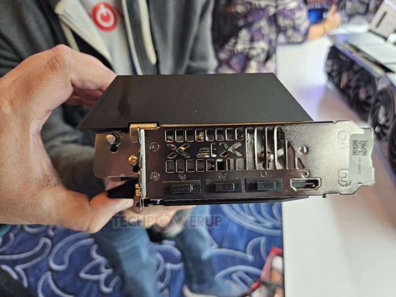 Чёрная модель имеет толщину четыре слота расширения. В этом дизайне будут выпускаться два варианта. Один не имеет RGB-подсветки. Другая версия будет более премиальной. В её верхней части расположен светодиодный диффузор RGB, охватывающий весь верхний передний край, включая треугольные концы с логотипами XFX и Radeon. Её на выставке не показали.