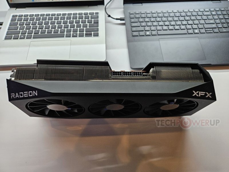 Белая карта тоже оснащена системой охлаждения с тремя вентиляторами, но её толщина составляет три слота расширения. Печатная плата новинки, похоже, занимает 2/3 длины всей видеокарты. Таким образом, воздух от третьего вентилятора также свободно проходит через большую прорезь в задней части усиливающей пластины. Эта модель оснащена двумя 8-контактными разъёмами питания.