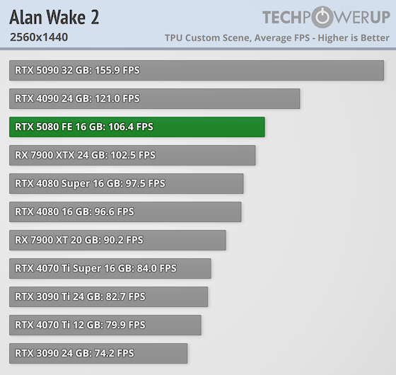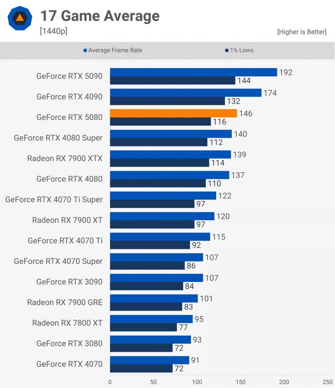 изображения (24) Тесты портала TechPowerUp в целом подтвердили результаты коллег, хотя и показали чуть лучшую для RTX 5080 картину: новинка опередила RTX 4080 Super в среднем на 6 % в Full HD, на 9 % в 1440p и на 12 % в 4K. Схожие цифры приводит и немецкий портал ComputerBase. А вот если сравнивать с GeForce RTX 3080, то здесь разница уже очень заметна — около 37–43 %.