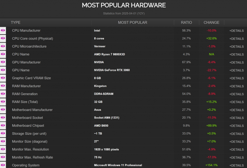Статистика также отражает изменения в популярности брендов GPU. Nvidia за год потеряла 6,4 % своей доли рынка, которая теперь составляет 67,9 %. В свою очередь, AMD увеличила свою долю на 16,6 %, доведя её до 31,1 %. Доля видеокарт Intel составляет 0,7 % валидаций, что свидетельствует о росте на 27 % за год.