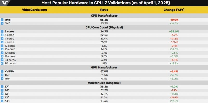 Согласно последним данным, доля процессоров Intel в базе данных валидации CPU-Z составляет 56,3 %. Чипы Intel по-прежнему доминируют на платформе, однако их доля за последний год снизилась на 10 %. В то же время доля процессоров AMD выросла на 16,6 % и теперь составляет 43,7 %.