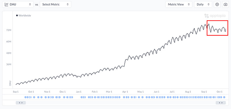 Статистика показывает, что, например, в США среднее время, проводимое одним ежедневным активным пользователем (DAU), сократилось на 22,5 % с июля, а среднее число сессий на одного DAU уменьшилось на 20,7 %. Это говорит о том, что американские пользователи стали реже открывать приложение. При этом отток пользователей (в США) снизился и стабилизировался, что может означать формирование ядра постоянных пользователей, в то время как краткосрочные посетители уже покинули платформу.