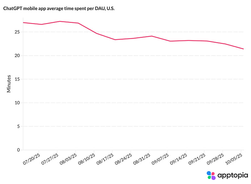 Аналитическая компания Apptopia, специализирующаяся на данных о мобильных приложениях, сообщила о замедлении роста числа загрузок и ежедневной активности пользователей мобильного приложения ChatGPT. По её оценкам, темпы роста новых глобальных загрузок начали снижаться после апреля, а октябрь, по предварительным данным, покажет падение на 8,1 % по сравнению с предыдущим месяцем.