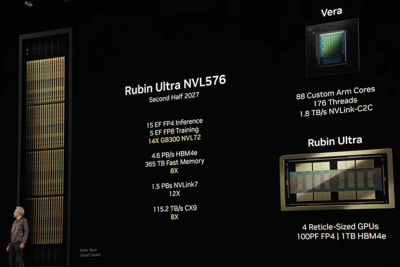 Nvidia также раскрыла детали о системе NVL576 на базе чипов Rubin Ultra, которые ожидаются во второй половине 2027 года. Эти чипы будут включать четыре крупных GPU-чиплета на одной подложке и 1 Тбайт памяти HBM4e. В итоге система NVL576 обеспечит производительность до 15 Эфлопс FP4 и 5 Эфлопс FP8, предлагая до 365 Тбайт быстрой системной памяти и сетевую пропускную способность до 1,5 Пбайт/с через NVLink.