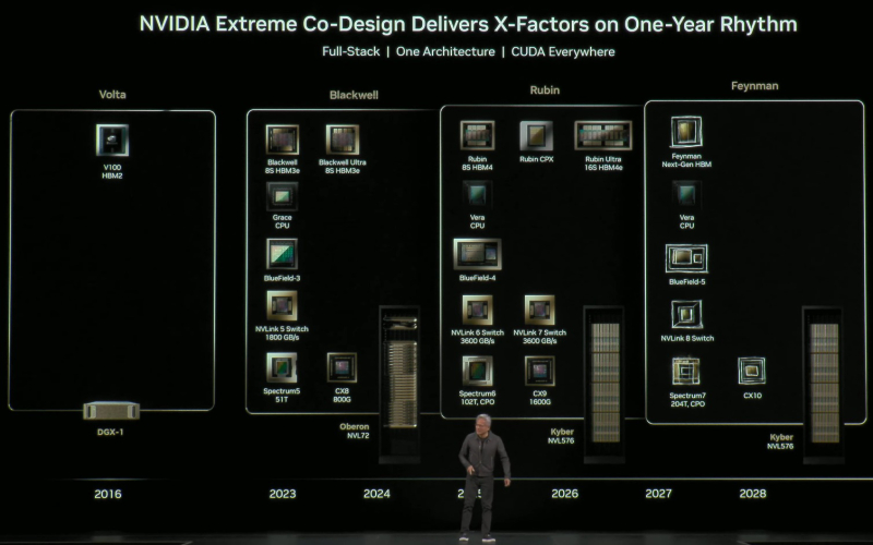 Nvidia сообщила, что первые тестовые экземпляры Rubin уже поступили в лаборатории компании для испытаний, а старт массового производства запланирован на 2026 год. На смену этой архитектуре придёт совершенно новая архитектура Feynman, запуск которой намечен на 2027–2028 годы. Однако никаких чипов на этой платформе Nvidia пока не показала — вряд ли на данный момент они вообще существуют в физическом воплощении.