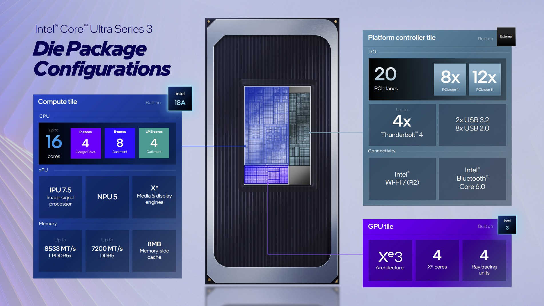 Серия процессоров Core Ultra Series 3 представлена тремя основными конфигурациями: 6-ядерной (2 производительных P-ядра Cougar Cove + 4 энергоэффективных LPE ядра Darkmont), 8-ядерной (4 P ядра + 4 LPE ядра), а также двумя 16-ядерными (4P + 8E ядер Darkmont + 4LPE). Ключевыми отличиями между двумя последними конфигурациями является количество поддерживаемых линий PCIe. Одни предлагают поддержку до 20 линий PCIe (8 PCIe 4.0 и 12 PCIe 5.0), другие — лишь 12 линий (8 PCIe 4.0 и 4 PCIe 5.0). Также чипы Panther Lake оснащены нейродвижком NPU с производительностью от 46 до 50 TOPS (зависит от модели чипа).