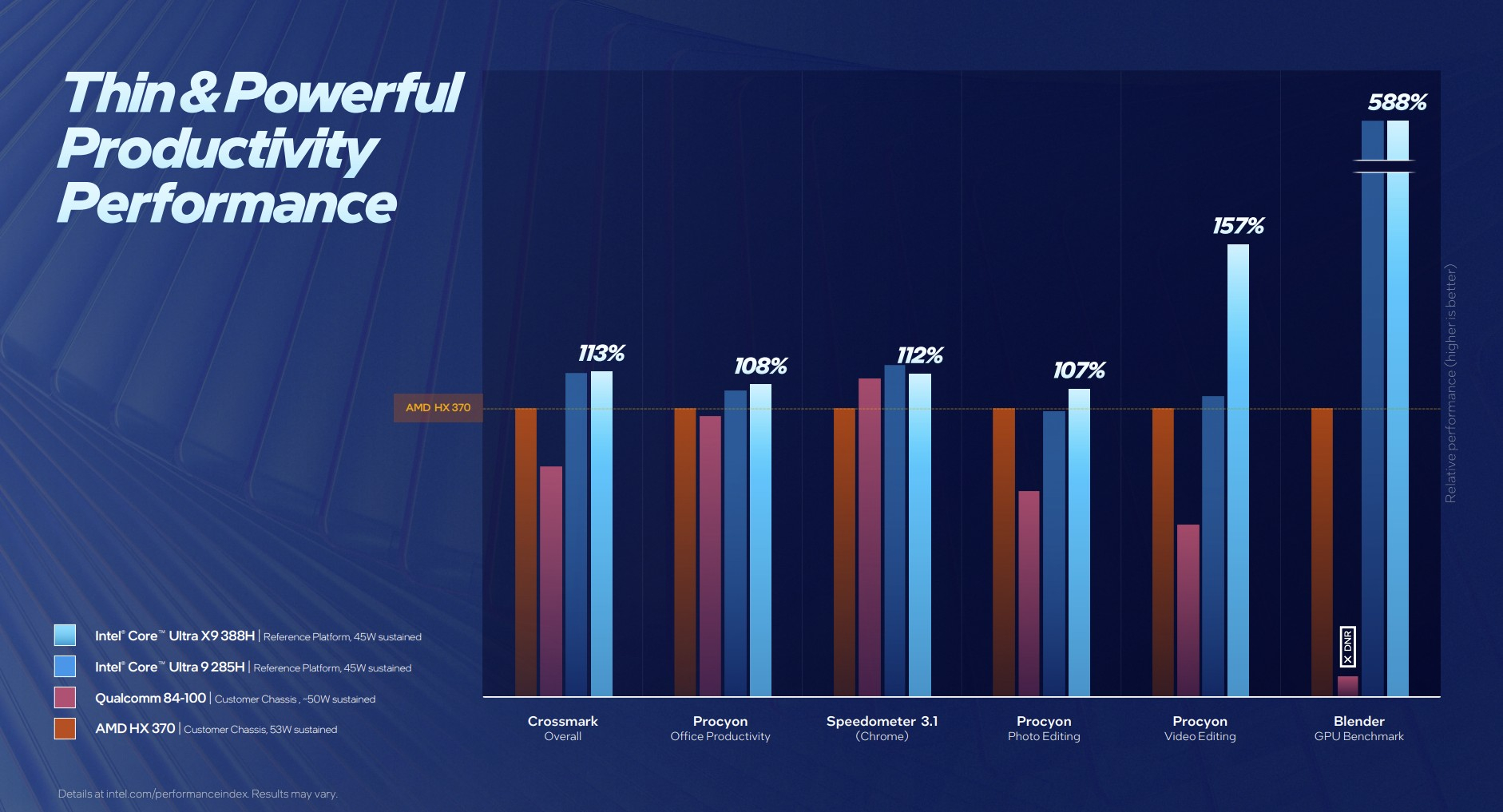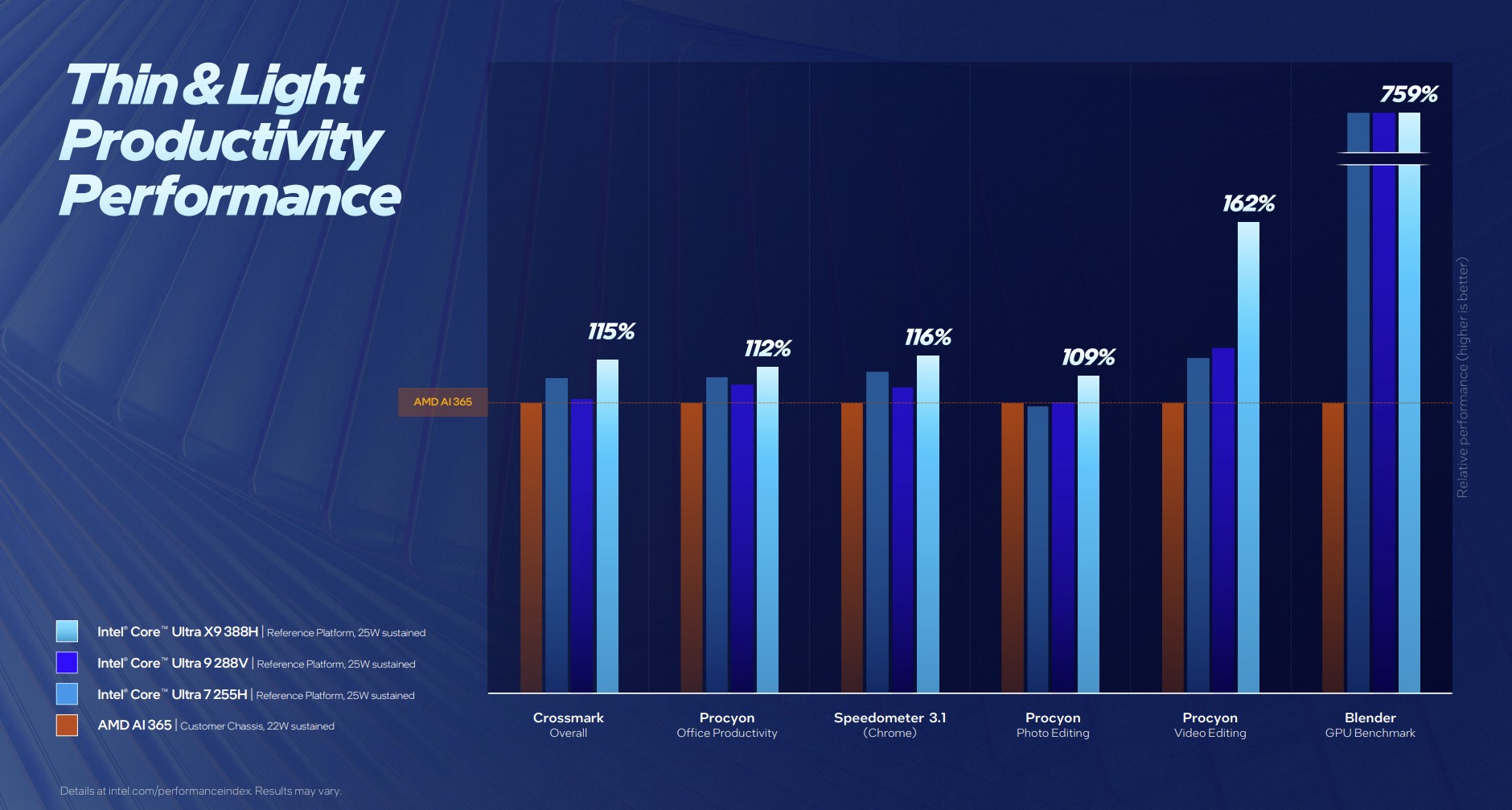Согласно тестам Intel, новые чипы обеспечивают в среднем до 10 % более высокую однопоточную производительность и до 60 % более высокую многопоточную производительность в синтетических тестах, а также до 77 % более высокую игровую производительность по сравнению с предшественниками серии Lunar Lake.
