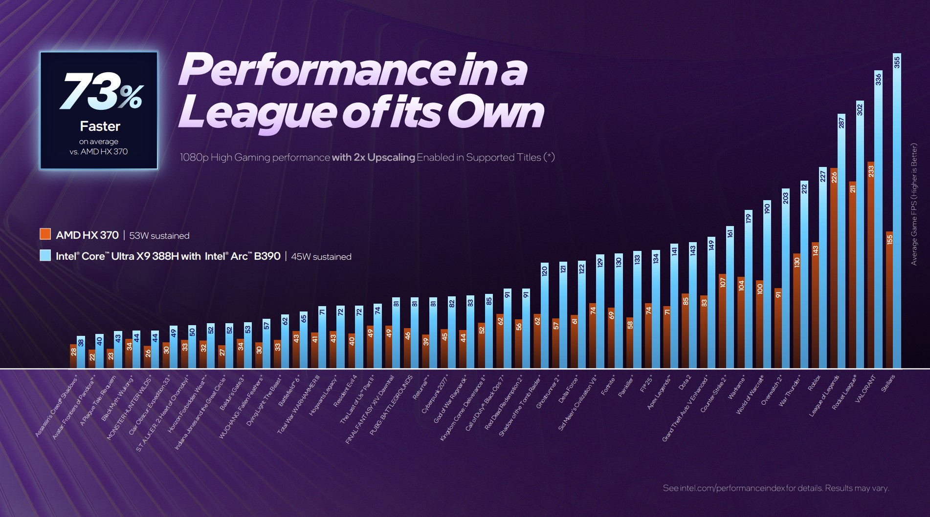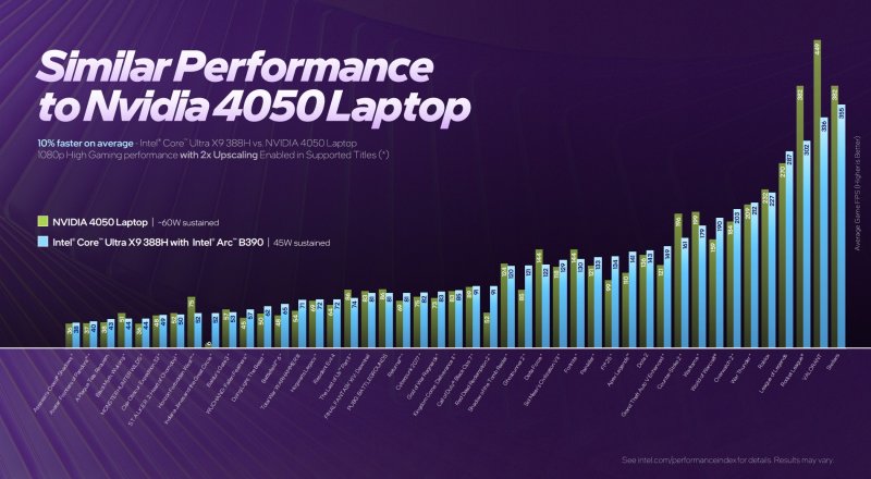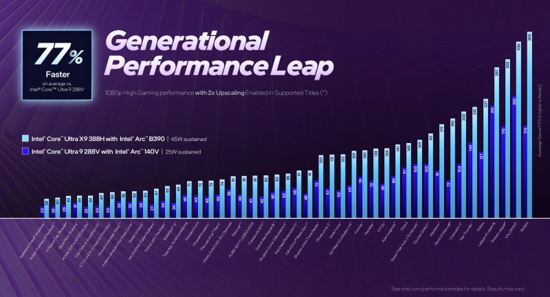 По словам Intel, графика Arc B390 обеспечивает производительность в среднем до 73–83 % выше, чем Radeon 890M в составе процессоров AMD Ryzen HX 370 (при TDP 53 Вт), до 76 % выше, чем графика Arc 140T (при TDP 45 Вт), до 2,6 раза выше, чем у чипов Qualcomm 84-100 (при TDP 50 Вт) и предлагает уровень производительности, аналогичный GeForce RTX 4050 (при TDP 60 Вт).