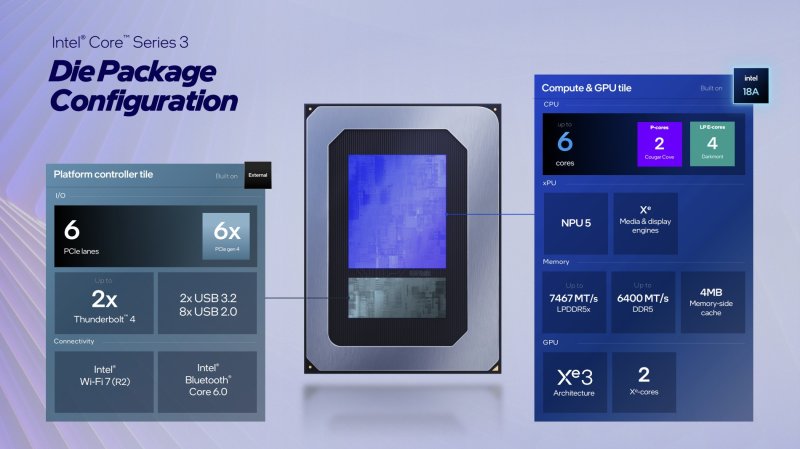 Intel официально представила серию мобильных процессоров Core Ultra Series 3 (Panther Lake). Компания заявила, что это первая потребительская платформа AI PC на фирменном техпроцессе Intel 18A (1,8 нм), разработанная и произведённая в США. В составе чипов Intel Core Ultra Series 3 задействованы технологии транзисторов RibbonFET и питания PowerVia (подвод питания с обратной стороны чипа). За счёт этого производителю удалось добиться повышения и производительности и энергоэффективности новых процессоров.