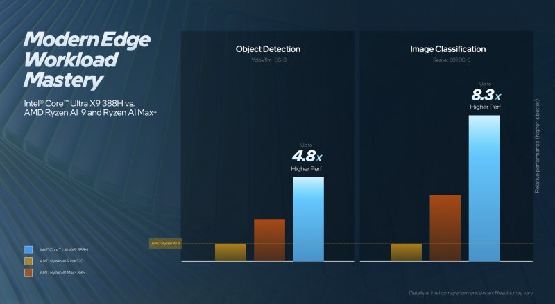 Что касается периферийных вычислений, Intel заявляет о приросте производительности в задачах искусственного интеллекта по сравнению с Nvidia Jetson Orin AGX 64GB. Intel говорит о 1,9-кратном повышении производительности в работе с LLM (задержка первого токена), о 2,3-кратном улучшении показателя производительности на ватт в расчёте на затраченный доллар для сквозной видеоаналитики, а также о 4,5-кратном увеличения пропускной способности в тестах модели действий в области компьютерного зрения. Intel также заявляет о превосходстве своих чипов над конкурентами от AMD в таких зачах ИИ, как обнаружение объектов и классификация изображений.