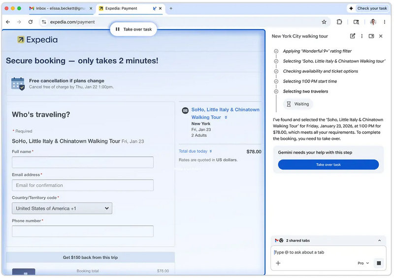 Однако самым амбициозным нововведением Google называет функцию Auto Browse — браузерного ИИ-агента, способного выполнять задачи от имени пользователя. В теории Gemini сможет самостоятельно перейти на сайт, найти нужный товар, применить купон на скидку и подготовить покупку. Своего рода автопилот для интернет-сёрфинга. При этом для чувствительных действий — входа в аккаунты или финального подтверждения платежа — система будет запрашивать вмешательство человека. Google подчёркивает, что данные из менеджера паролей и сохранённых карт не передаются ИИ-моделям напрямую.