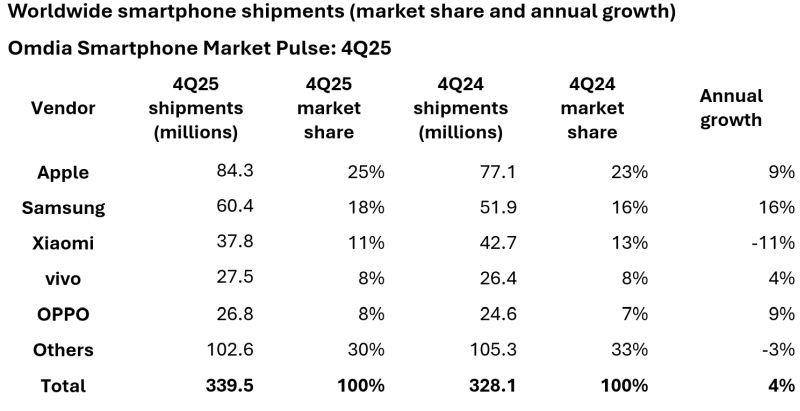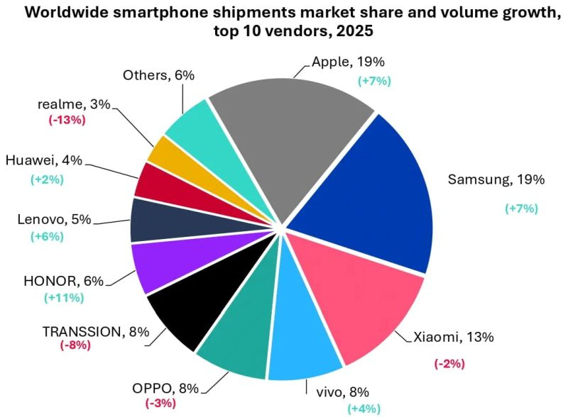 Vivo впервые вышла на четвёртое место благодаря росту объёмов продаж по итогам 2025 года на 4 % до $105,3 млн, в четвёртом квартале рост достиг всё те же 4 %. Формально, Vivo и Oppo завершили год с равными долями на мировом рынке смартфонов, измеряемыми 8 %. Правда, Oppo при этом сократила объёмы продаж на 3 % до 100,7 млн штук. Все остальные производители смартфонов сообща занимают по итогам 2025 года лишь 33 % мирового рынка, объёмы реализации при этом сократились на 2 % до 394,3 млн штук.