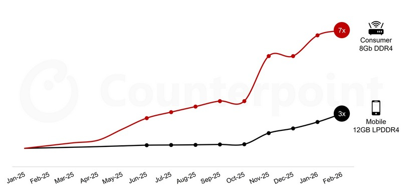 Подобными доводами делятся представители Counterpoint Research, которые напоминают, что цены на DRAM и NAND в прошлом году успели вырасти более чем на 600 %, если говорить о рынке потребительской электроники. Рост цен продолжится и в этом году, достигнув пика в июне, но даже после этого рубежа дефицит памяти будет сохраняться. Сегмент интернет-маршрутизаторов от роста цен и дефицита памяти пострадает сильнее всего, по мнению экспертов Counterpoint Research, особенно если говорить о небольших производителях, не обладающих весомыми позициями в переговорах.