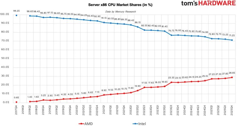 AMD завершила 2025 год с рекордным темпом роста, увеличив свою долю рынка в сегментах клиентских, настольных, мобильных и серверных процессоров и достигнув нового исторического максимума как по количеству отгруженных процессоров x86, так и по доле выручки. Успех AMD был обусловлен сильным продуктовым портфелем, а спад Intel стал результатом сочетания факторов, включая отсутствие конкурентоспособных предложений в высокопроизводительном сегменте рынка, а также ограничения поставок в нижнем ценовом сегменте.