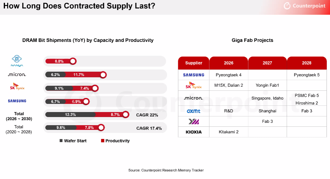 «В этом году ожидается, что производство DRAM такими компаниями, как Samsung Electronics, SK hynix, Micron, CXMT и Nanya, увеличится на 26 %, а NAND — на 24 %. Однако это не окажет никакого значительного воздействия на рынок до второй половины 2027 года. Дефицит предложения не будет решён примерно до конца второй половины 2027 года», — сообщил научный сотрудник Counterpoint Research Хван Мин-сон (Min-sung Hwang).