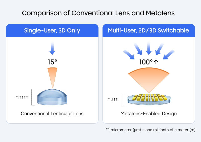 Samsung и учёные Пхоханского университета науки и технологий (POSTECH, Южная Корея) разработали тонкую оптическую систему, способную переключать дисплеи из режима 2D в 3D — эти дисплеи остаются тонкими, а для просмотра трёхмерного изображения не требуется надевать очки.