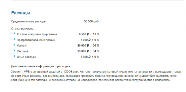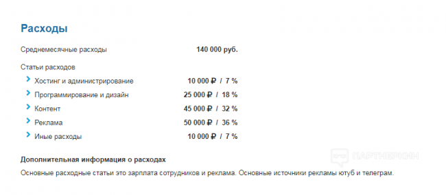 Среднемесячный расходы на момент продажи — 140 000 рублей. Основновные статьи затрат можно увидеть ниже. В штате работают модератор с зарплатой 36 000 рублей и программист с зарплатой 20 000 рублей (работают на удаленке).