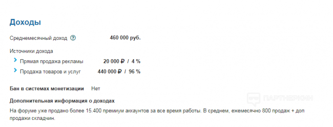 На момент продажи площадка приносила 460 000 рублей. 96% прибыли — продажа платных подписок (доступ на форум), 4% — реклама в Telegram каналах. За все время продано более 15 400 премиум аккаунтов.