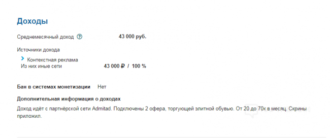 На момент продажи площадка приносила 43 000 рублей в месяц. Весь доход идет с Admitad, партнерской сети по модели с оплатой за действией. Подключены два оффера, торгующие элитной обувью.