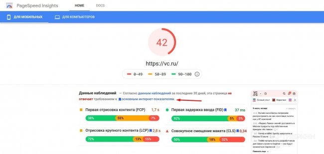 На VC.ru есть интересный кейс, в котором авторы делятся хитрым способом получить 100 баллов в PageSpeed. Когда бот Lighthouse скачивает содержимое страницы, он видит фейковую страницу, состоящую из пары строчек кода, которая не имеет ничего общего с реальным контентом. Если вы заказывали оптимизацию на бирже фриланса и внутренние страницы набирают 98-100 баллов, внимательно посмотрите отчёт PSI.