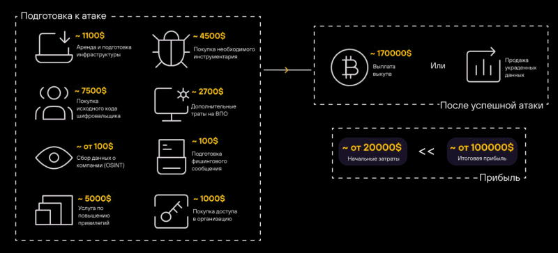 - Организация популярного сценария фишинговых атак с использованием шифровальщика обходится начинающим киберпреступникам минимум в 20 тысяч долларов США.