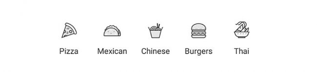 В некоторых случаях интерфейс требует более красочного стиля иллюстраций. Например, детализированные значки на вебсайте Yelp – отличный способ показать популярные запросы поиска еды/ресторанов. Креветка, изображенная на иконке тайской кухни, просто восхитительна: